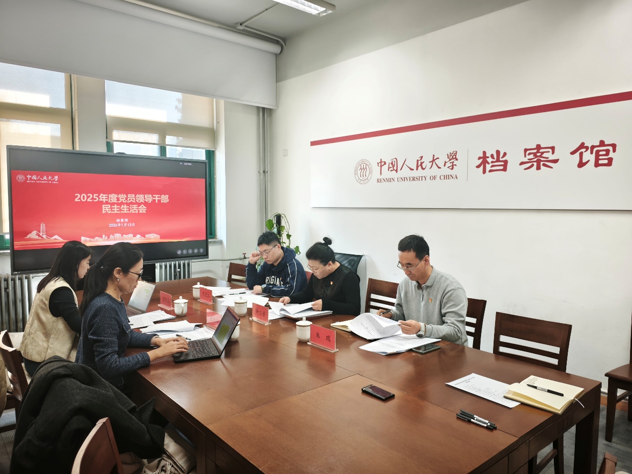 1月13日下午,按照中国人民大学党委统一部署和要求,档案馆召开2025年度党员领导干部民主生活会。学校第十二督导组组长沃晓静、组员党之玉到会指导。档案馆领导班子成员钟兰芳、朱瑞、周文泓(挂职)参加会议。会议由档案馆党支部书记、馆长钟兰芳主持。